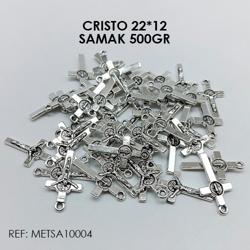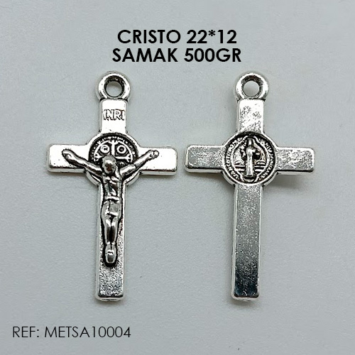 Cristo en material zamak, con un alto de 22mm y un ancho de 12mm cada uno, este viene con la ilustración de jesucristo acompañado con el sello de San Benito. Muy llamativo y fácil de utilizar para la creación de collares, llaveros, denarios, rosarios y demás accesorios de cualquier tipo de material.
